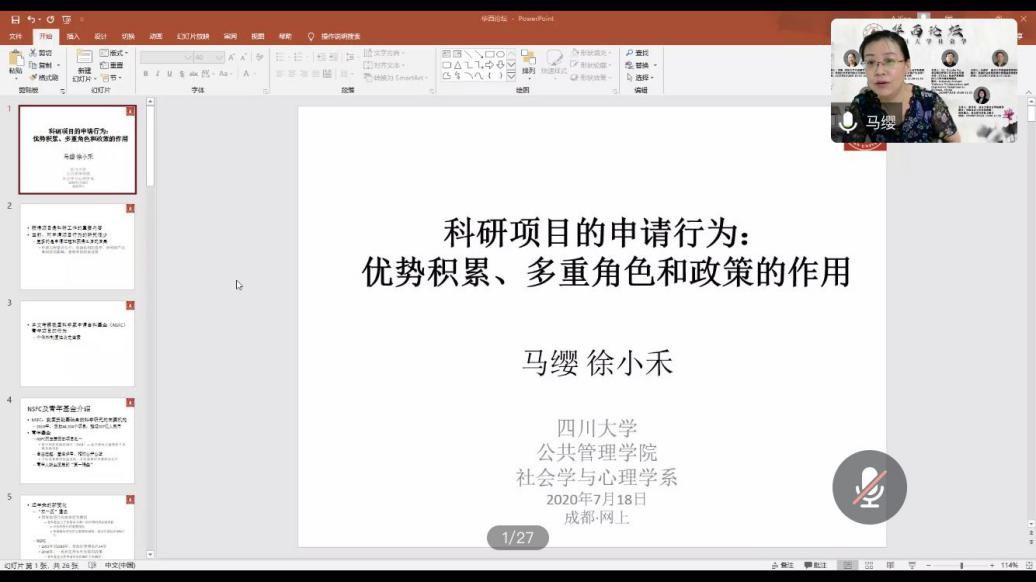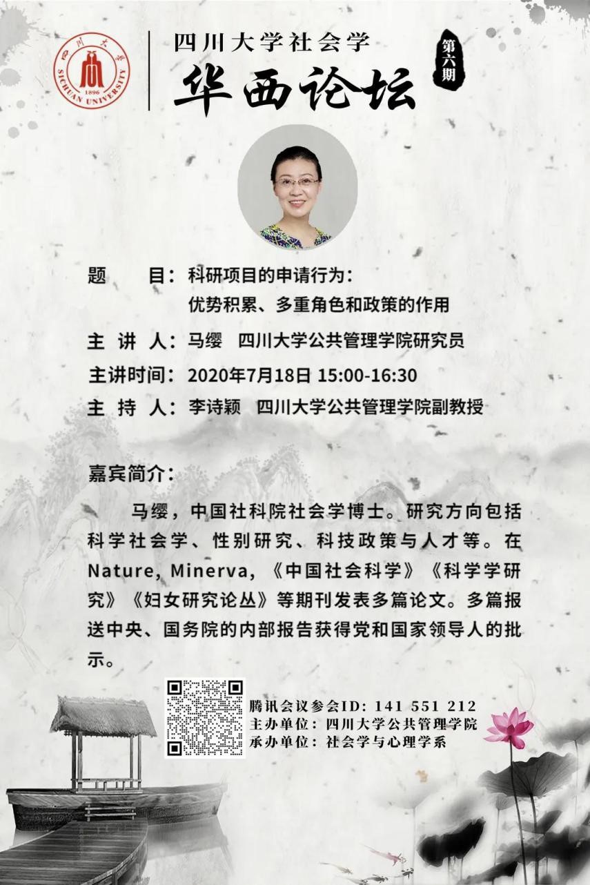 2020年7月18日下午15:00,四川大学社会学华西论坛云系列讲座第六期于线上成功举行。四川大学best365中国官方网站社会学与心理学系马缨研究员发表了题为“科研项目的申请行为:优势积累、多重角色和政策的作用”的精彩演讲。讲座由社会学与心理学系李诗颖副教授主持,百余名来自我校和省内外兄弟院校的师生参加了讲座。