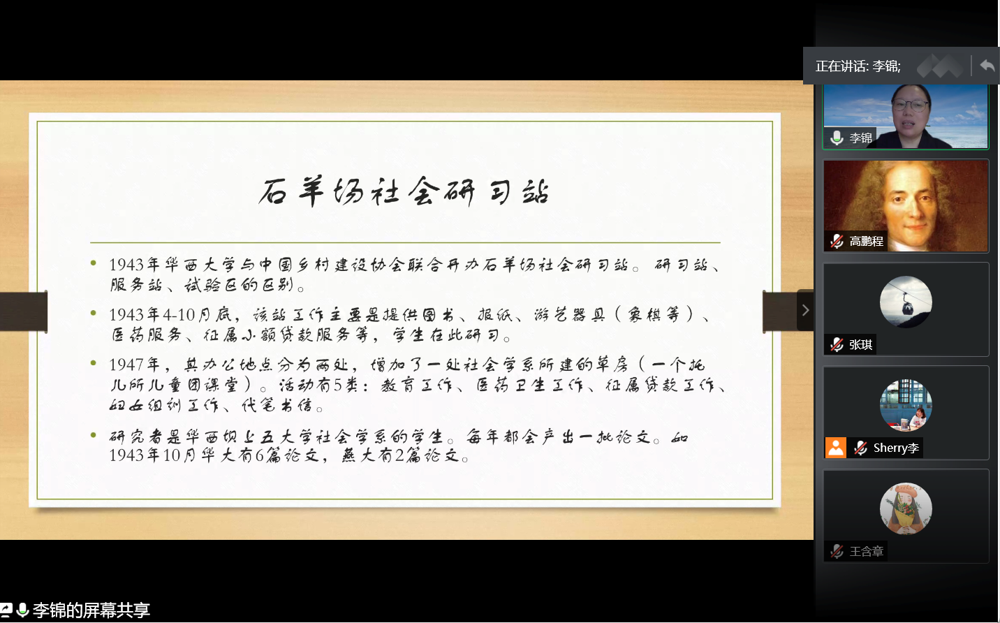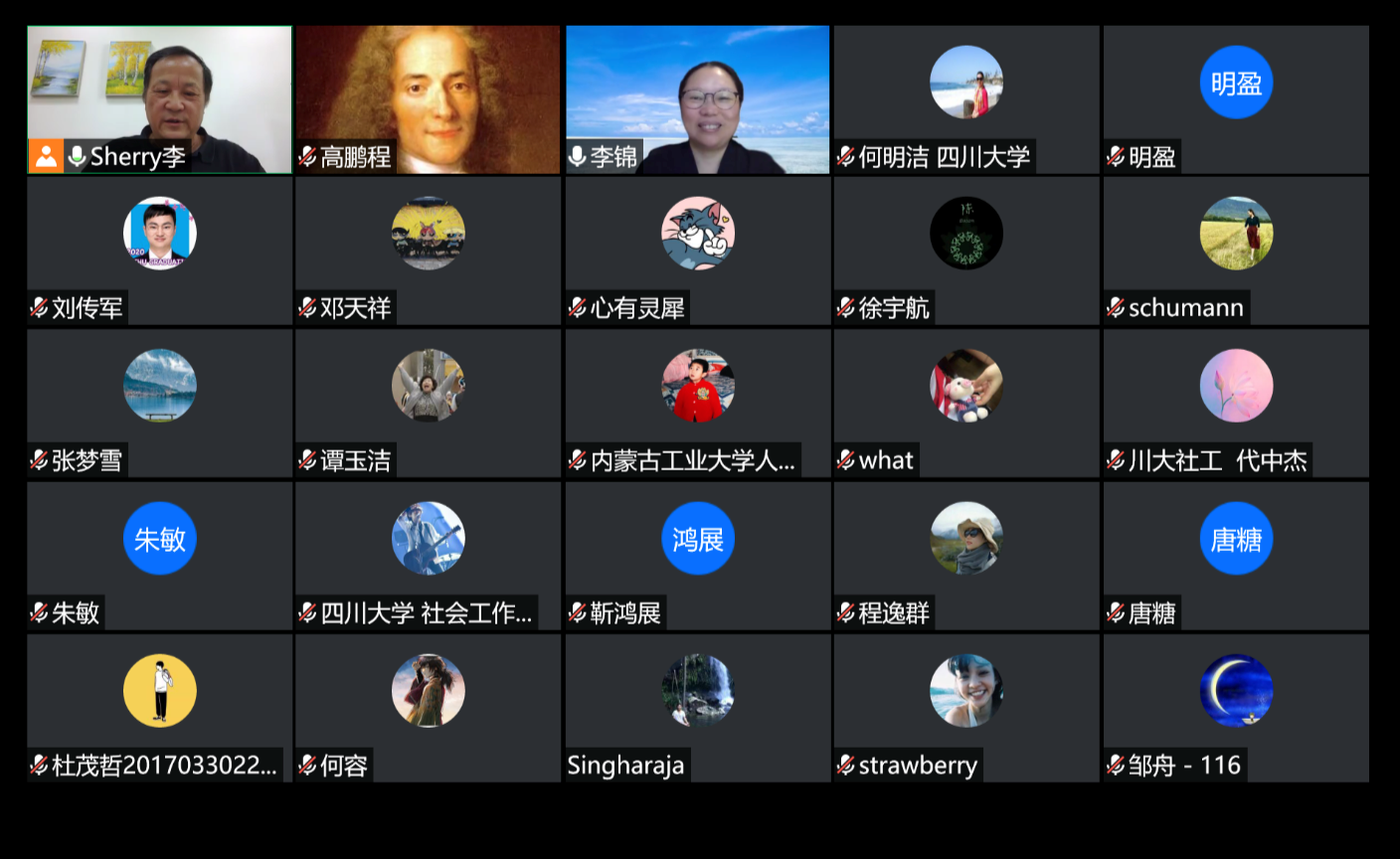 在讲座的问答环节,师生们就“社会学如何更好地传承”“社会学该怎样接地气” 等问题与李锦教授进行了深入的交流。倾听历史回响以服务社会,植根中国现状以发展社会学,李锦教授对华西社会学研究的发展回顾,使大家对社会学西部研究的传统与精神形成了深入、全面、系统的理解。老师和同学们一致认为,四川大学社会学现在的研究聚焦于民族/宗教研究与边疆社会学、乡村社会学与扶贫研究、城市社区研究与社会工作等,是对百年华西社会学研究传统的继承和发展。在讲座结束之际,所有与会者用热烈的掌声在云端向李锦教授表达了诚挚的感谢。
