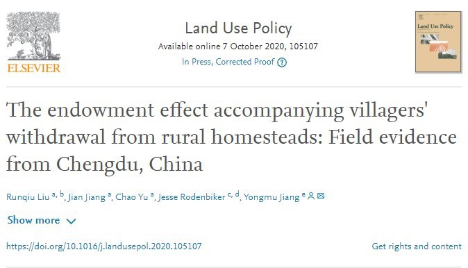 我院刘润秋师生等人于2020年10月在国际知名的土地政策顶级期刊《Land Use Policy》上发表学术论文《The Endowment Effect Accompanying Villagers' Withdrawal from Rural Homesteads: Field Evidence from Chengdu, China》。该论文属于刘润秋教授主持的国家社会科学基金项目“典型试点区域宅基地退出的绩效评价与路径优化研究”(项目号:17BJY091)的阶段性研究成果。我院土地资源与房地产管理系刘润秋教授为第一作者,硕士生蒋健为第二作者,博士生余超为第三作者,刘润秋教授指导的加州大学伯克利分校访学博士生Jesse Rodenbiker(现为康奈尔大学“阿特金森可持续发展研究中心”博士后)为第四作者。