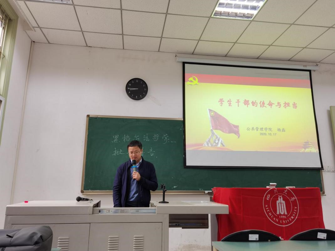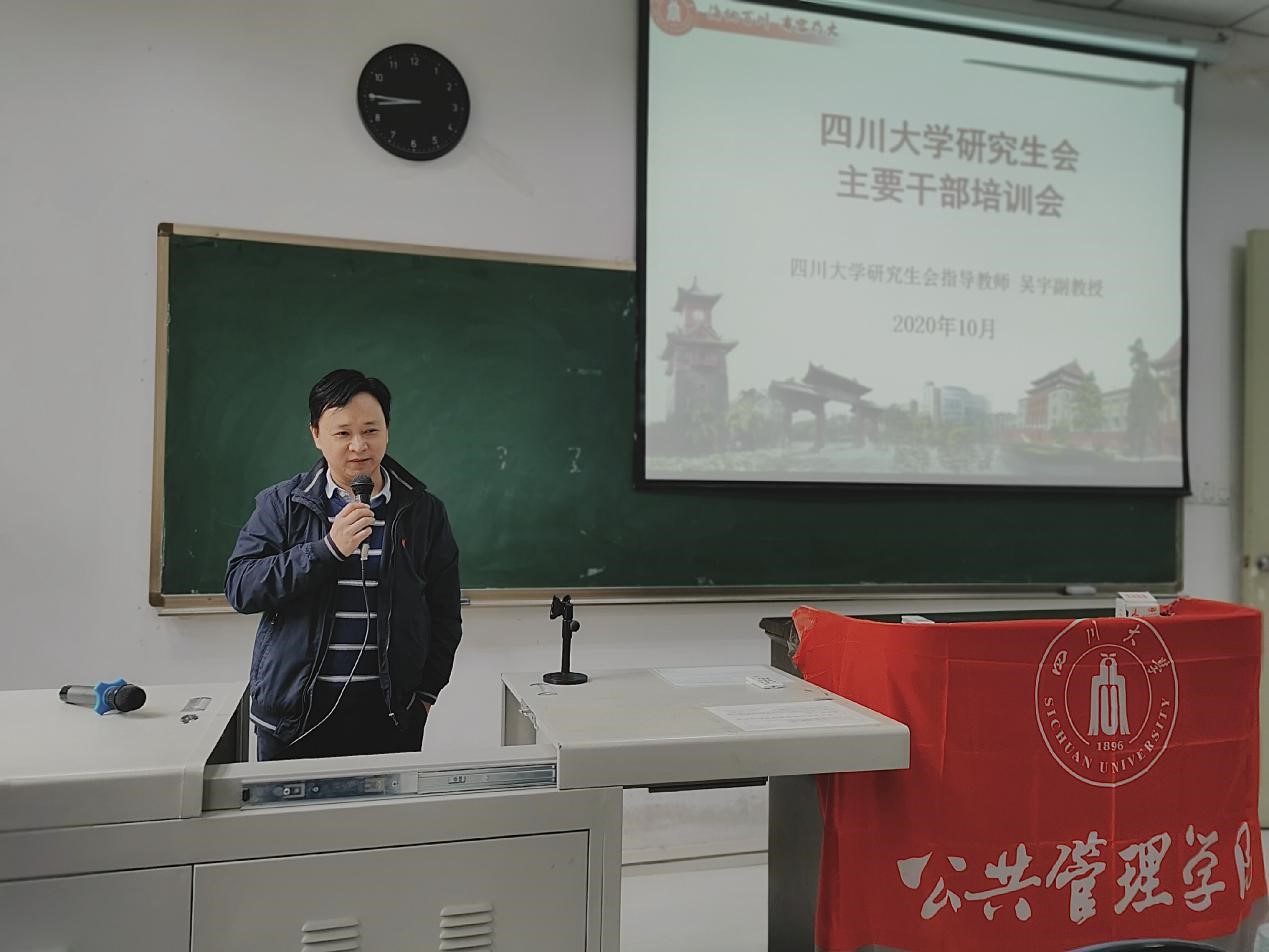 吴宇副教授以《如何做好研究生干部》为题,从为什么要做学生干部、怎样做好学生干部两方面出发,首先介绍了四川大学研究生会的指导思想、组织性质及干部的培养体系,接下来,吴宇副教授向参会学员强调,做好研究生会干部的核心是坚持研究生会干部自我管理,自我教育,自我服务。最后,吴老师希望研究生会干部具有过硬的政治素养,并对公管研究生会的学生干部提出了更高的要求。