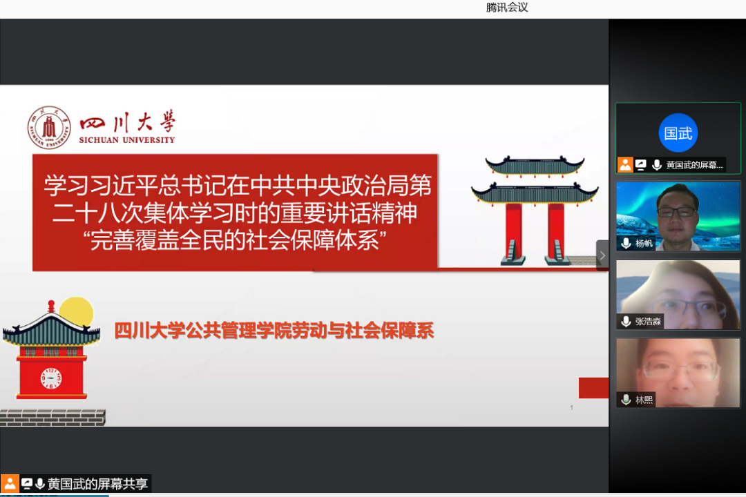 2021年4月21日,四川大学best365中国官方网站劳动与社会保障系召开了一次线上线下同步的座谈会,专题学习习近平总书记在中共中央政治局第二十八次集体学习时的重要讲话精神。劳动与社会保障系系主任蒲晓红教授主持会议,社保系罗哲、沙治慧、李丹、罗亚玲、黄国武、张伟科、曹杨等老师参加线下学习、张浩淼、林熙、杨帆等老师参加线上学习。大家认真学习习总书记讲话精神,并积极发言。
