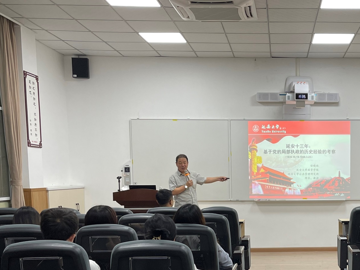 讲座伊始,任晓林教授以红色版画“希望之光”和延安大学校徽引出延安十三年主题,并紧紧围绕中国共产党在延安十三年局部执政期间形成的“政治之本”、“经验之本”、“思想之本”和“人力之本”,系统而深刻地阐述了中国共产党由弱变强,毛泽东思想日益成熟、丰富发展,延安精神孕育形成和发扬光大的伟大历程。任晓林教授指出,延安是中国共产党人的精神记忆,是中国共产党执政的实践基地,更是中国共产党成长成熟的保育床。从中国共产党建立新中国,实现中国人民站起来,到中国共产党带领全国人民实行改革开放,实现中国人民富起来,再到党带领全国人民实现中华民族伟大复兴的中国梦,让中国强起来,延安十三年的局部执政经验,都发挥了极其重要的作用。