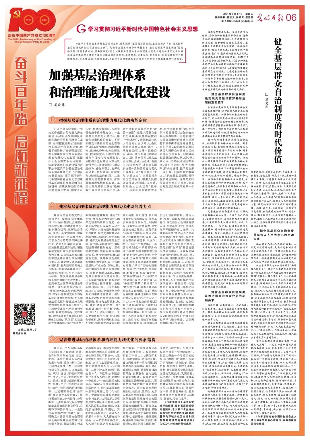习近平总书记高度重视基层治理工作,反复强调“基层强则国家强,基层安则天下安,必须抓好基层治理现代化这项基础性工作”。党的十九届五中全会明确提出了“基层治理水平明显提高”的战略目标,近期中共中央、国务院印发《关于加强基层治理体系和治理能力现代化建设的意见》,就加强基层治理体系和治理能力现代化建设的指导思想、基本原则、主要目标、重点任务、组织保障等作了前瞻性布局、全局性谋划、系统性部署,为新时代加快推进基层治理现代化提供了根本遵循和行动指南。