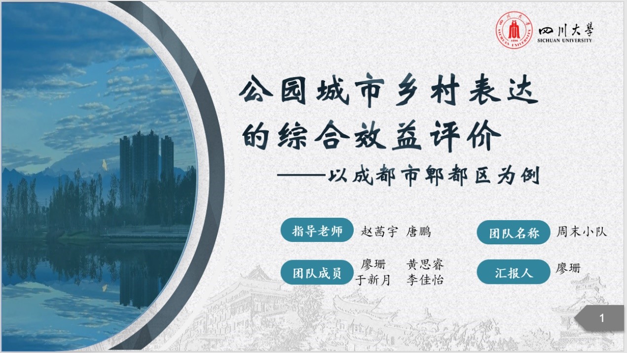 由我院土管系2019级本科生廖珊、黄思睿、于新月、李佳怡组成的周末小队,立足城乡融合发展,探索成都市郫都区公园城市乡村表达的综合效益评价,结合调研获取的数据资料,获得郫都区在公园城市理念指导下乡村实施效果的社会反馈,为郫都区未来的优化发展献策,以求创新诠释公园城市的乡村表达,助力城乡融合发展。