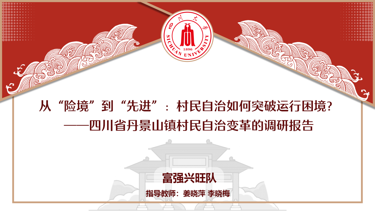 由我院行政管理系姜晓萍教授、李晓梅副研究员担任指导老师,2019级行政管理专业研究生唐银彬,2020级行政管理专业研究生杨舒雯、尹雨晴、郑冰鑫、李千惠、杨晓玉六位同学同学组成的富强兴旺队,完成了《从“险境”到“先进”:村民自治如何突破运行困境?——四川省丹景山镇村民自治变革的调研报告》,在经过初步专家评审、双向匿名评审、线上答辩等环节后,荣获一等奖,充分展示我院行管学子对“行以明德,管以兴邦”信念与目标的坚定。