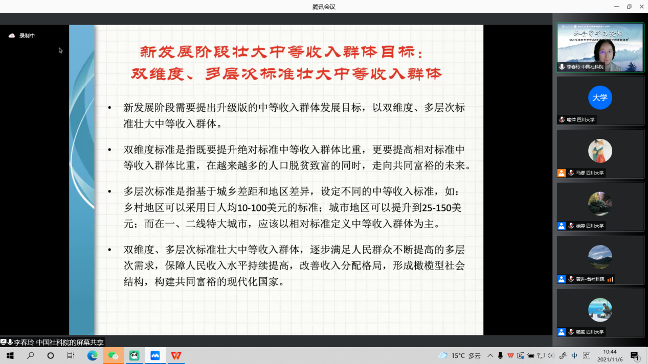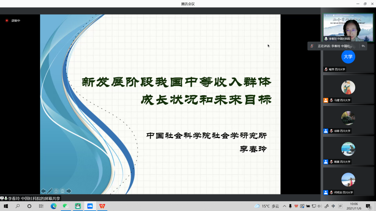 2021年四川省社会学年会于11月6日在四川大学best365中国官方网站召开,此次会议采取线上的方式举行,有近200人参与了此次年会。中国社会科学院社会学研究所研究员、博士生导师、青少年与社会问题研究室主任李春玲在大会上围绕“新发展阶段我国中等收入群体成长状况和未来目标”做了主题发言。