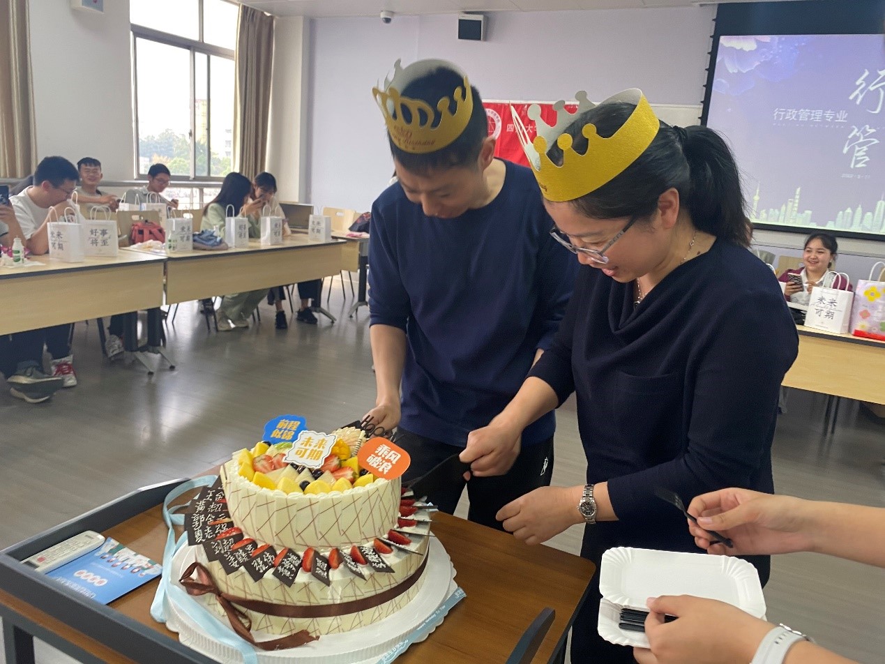 在师生默契欢乐过程中,象征相亲相爱一家人的大蛋糕由班委悄然推出,老师们看着蛋糕巧克力上印着了自己的名字,非常激动,这既表达了同学们对老师们的感谢和对行政管理大家庭紧密团结、奋发向上的美好祝愿。最后由范逢春老师、衡霞老师作为代表,完成了切蛋糕仪式。一曲落幕,见面会也进入了尾声。全体师生慷慨激昂地合唱了系歌——《真心英雄》,并于图书馆前合影留念。
