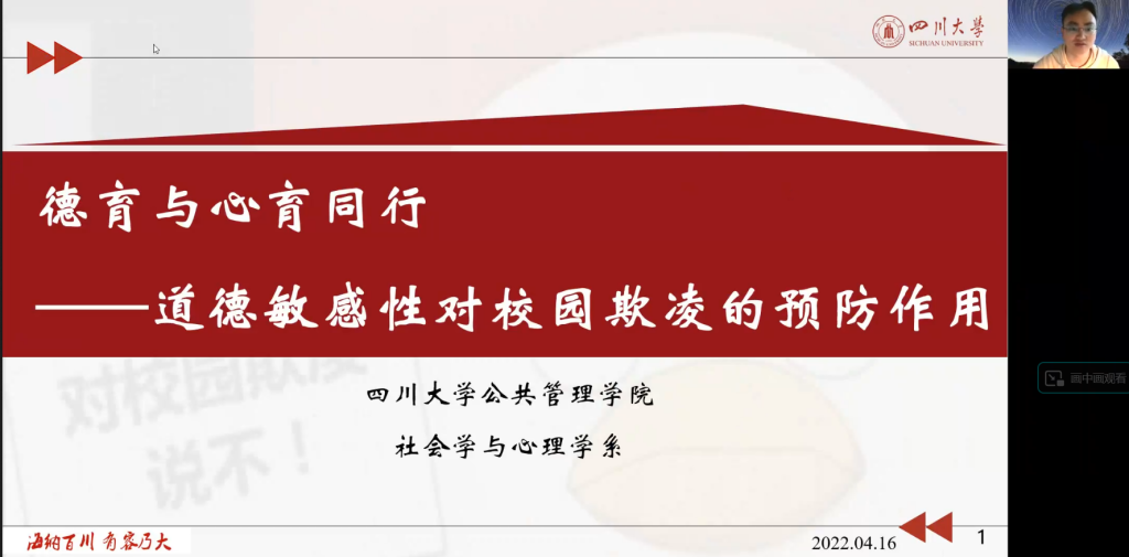 为了将研究结果反馈给一线教师,并推动校园欺凌干预课程的开发工作,4月16日,项目组召开了“德育与心育同行:道德敏感性对校园欺凌的预防作用”线上研讨会,校园欺凌领域专家、中小学校长及教师等约50人参会。刘传军老师对四川省社会科学“十四五”规划2021年度项目的资助、四川大学best365中国官方网站自主科研计划的支持,以及参与本次调研的专家及一线教师致以谢意后,应用心理硕士生谢忠桔对调研的基本过程与结果进行了总结汇报。在随后的自由讨论环节,沈潘艳副教授根据自身课程设计经验,提出可以从学生的认知失调、情绪觉察能力方面入手,引导学生关注受害者被欺凌时的具体情况以及由此带来的痛苦,以增加其对受害者的帮助行为。一线心理健康教师代表、来自天府四中的蔡倩老师,结合实务经历指出,一方面,欺凌相关的校园情景剧以及权威人士对欺凌法律责任的普及可能对反欺凌起到一定推动作用,而另一方面,为学生明确欺凌定义可能起到反作用,如“欺凌”一词可能成为学生之间取笑的工具,因此,反欺凌课程的设计中诸多细节不容忽视。