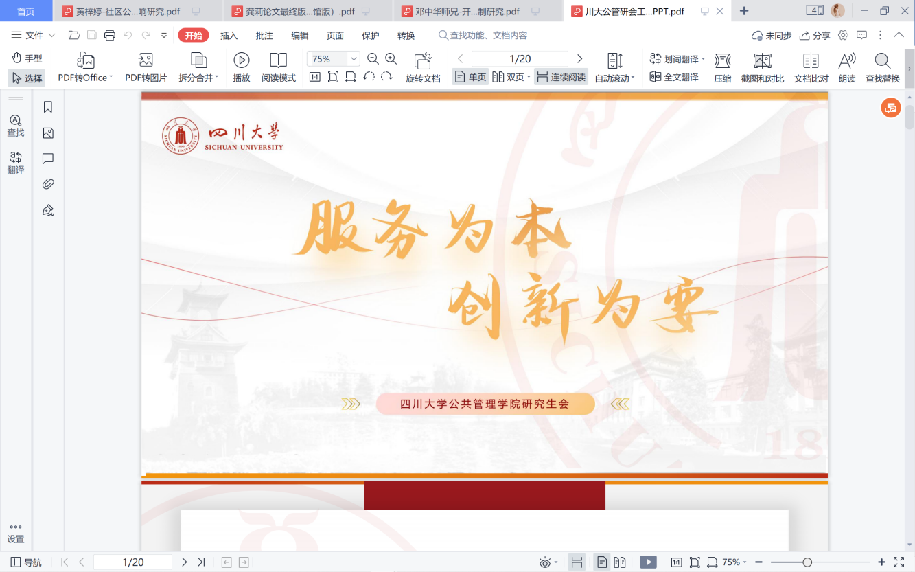 首先,各校公管学院研究生会交流了工作成效与经验。我院研究生会主席侯捷同学以“服务为本、创新为要”为主题,从我院研究生会的组织架构、部门建设、干部能力提升等方面介绍,并以“思想引领”、“钻研崇学”、“强化实践”、“文体兼荣”四个维度开展工作回顾与经验总结。目前,我院研究生会已连续9年获评“四川大学十佳研分会”,并于2020年获评“成都市优秀研究生分会”。best365中国官方网站团委于今年荣获 “四川省五四红旗团委”称号。各校公管学院研究生会在分享中学习,在交流中进步,真正实现了共话发展、共创佳绩。