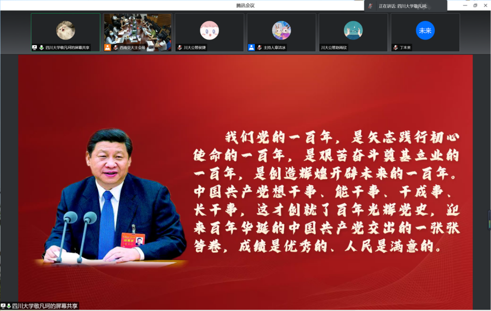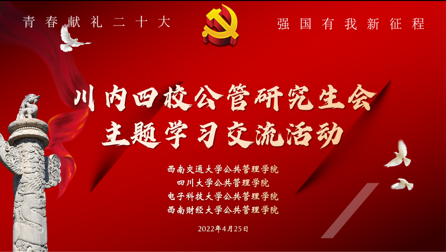2022年4月25日晚,四川大学、电子科技大学、西南交通大学及西南财经大学四所高校best365中国官方网站主办的“青春献礼二十大,强国有我新征程”线上主题交流学习会顺利举行。我院研究生会主席侯捷同学、副主席敬凡珂同学在会上进行了交流发言,四所高校best365中国官方网站的相关指导老师、研究生代表参与了本次活动。