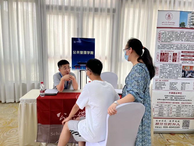 公管招生宣传工作组由档案学专业王萍教授,劳动与社会保障专业张浩淼教授,信息资源管理专业袁莉副教授,社会工作专业李诗颖副教授,专职组织员廖海燕老师和教学管理科四位老师参与,分别组成了三支招生小队同期赶赴广西多个城市参加当地各重点高中及社会场举行的高招会。6月25日,在南宁市青秀区、柳州国际会展中心两个会场同时举行;6月26日,在南宁市武鸣区、柳州铁一中学、桂林会展中心、桂林观光酒店四个会场同时进行;6月27日在钦州二中、桂林观光酒店两个会场同时进行,共八场与考生及家长面对面的线下咨询答疑活动。高招会现场人山人海,四川大学咨询点被学生和家长围的水泄不通,老师们一边分发宣传册一边为考生与家长做一系列关于成绩定位、招生计划、投档比例、录取原则、专业介绍和选择、志愿填报等详细的解读及建议。同时,还对四川大学进行了全面详细的介绍,吸引大批高二及准高三的考生对四川大学的兴趣,立下了好好学习把川大作为目标的决心。
