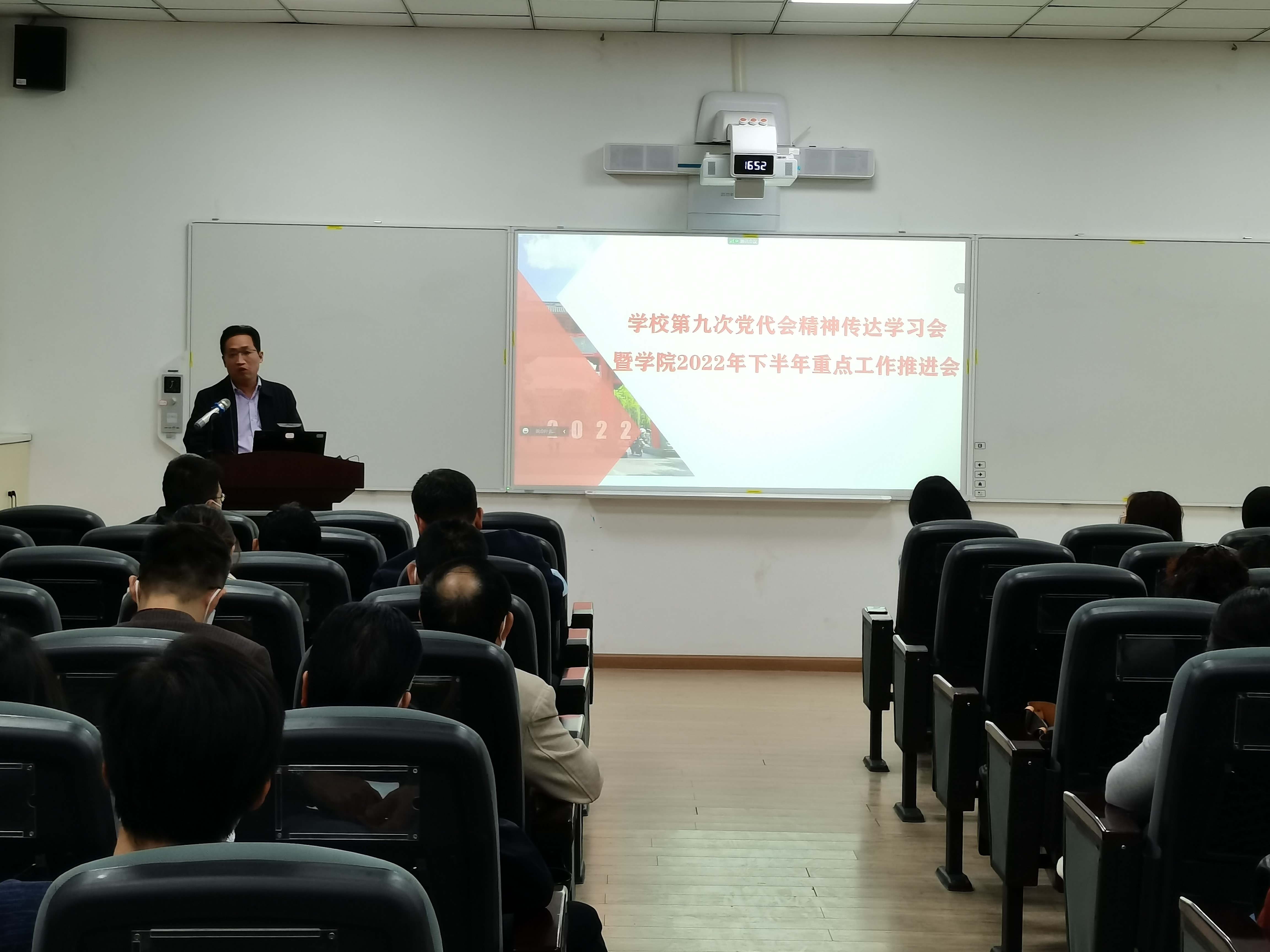 2022年10月9日下午,best365中国官方网站在萃文楼105报告厅召开学校第九次党代会精神传达学习会暨学院2022年下半年重点工作推进会。会议由学院党委书记韩杰主持,学院全体班子成员,“两委”委员、系主任、支部书记、科级干部,全体教职工及学生代表参加会议。