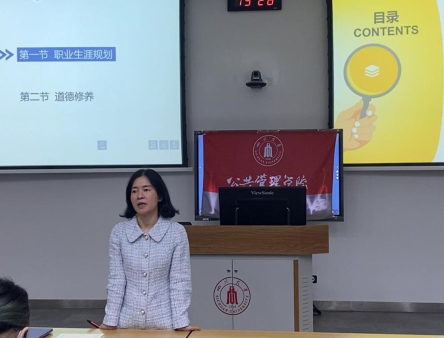 接着,国际交流与合作处副处长蒲诗璐以《提升视野,全面发展——从四川大学走向全球高等学府》为题,向同学们就出国深造进行专题授课,课程由我院专职辅导员刘碧主持。蒲诗璐老师从科学发展的视角引导同学们逐步开启大学生活中的每一步,依次从毕业生的路径选择(what)、出国深造的必要性与可行性(why)、如何从川大走向全球高等学府(how)三个维度,帮助同学们拓展发展视野、提升全球胜任力,探索符合自己的发展路径。