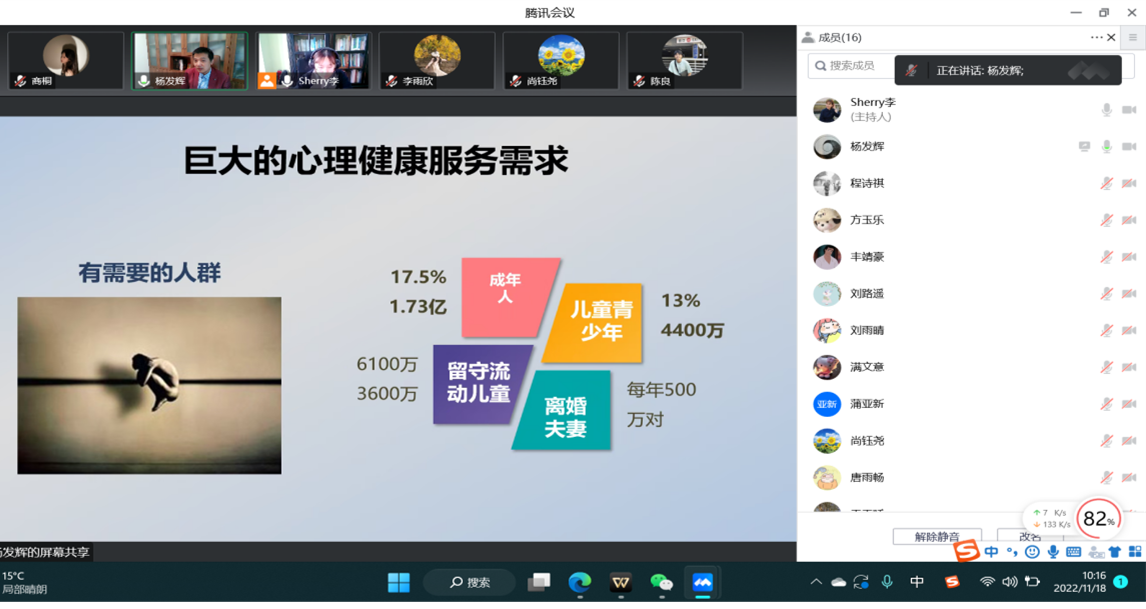 2022年11月18日,四川大学best365中国官方网站2022级应用心理专业的发展心理学的课堂上邀请到西南大学心理学部心理咨询研究与培训中心主任、中国心理卫生协会认证首批心理督导师,国际认知行为治疗学院认证认知行为治疗师、认知行为治疗培训师(督导师)杨发辉老师给同学进行线上讲座。