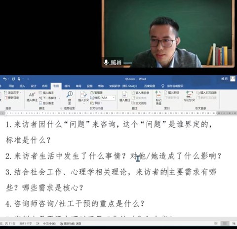 特邀嘉宾臧肖副教授着眼于近期同学们重点学习的“儿童青少年心理健康问题”章节,以“提出问题-案例概述-回应问题-交流互动”为主线,开展师生互动式的儿童心理健康案例研讨。活动开场,臧教授首先进行了简短的自我介绍和“互动方式测试”,幽默的话语让现场氛围变得轻松和谐。紧接着,他引入了六个主要问题作为案例分享后的讨论焦点。“两大案例”的分享就此展开。