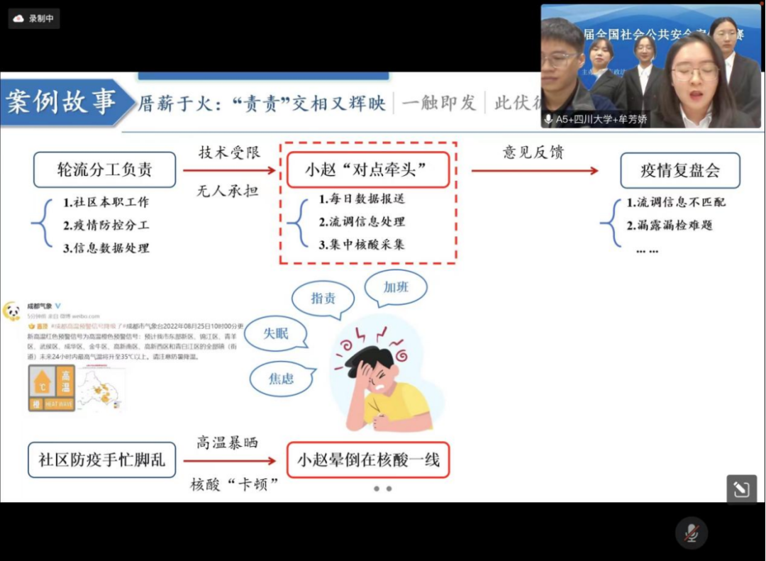 经过充分准备和激烈角逐,来自我院的两支学生队伍脱颖而出。由信息资源管理系的杨峰教授指导,信息资源管理专业2021级本科生高翊君、章耘菲、刘鑫雨、张思颖、雷青青组成的“花开富贵队”,完成了《从“爆红”到“暴洪”:“8•13”彭州山洪”事故中社区应急管理体系的困境与优化路径研究》的案例分析报告,并通过决赛现场8分钟的陈词环节和7分钟的答辩环节,表现优异,荣获大赛一等奖。