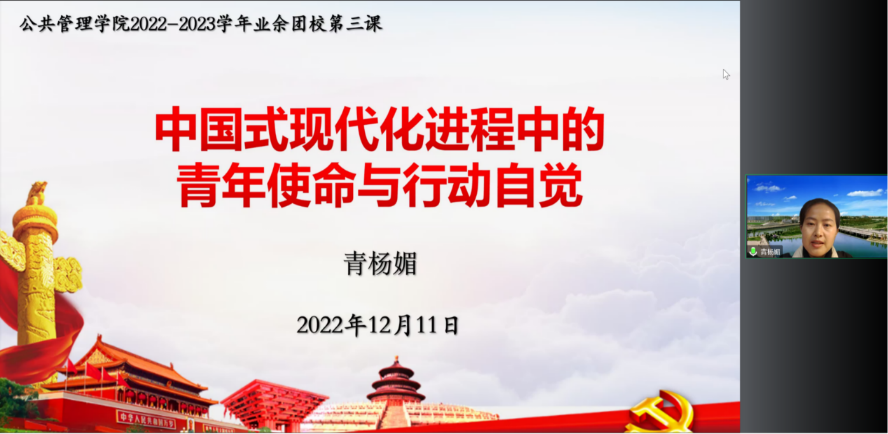 为学习二十大精神,深入了解中国式现代化深刻内涵,鼓励青年大学生勇担使命、奋发有为,best365中国官方网站2022—2023学年团校第三次行课于12月10至11日举行,受疫情影响,本次团校以线上腾讯会议授课形式进行。本次团课分为两个单元,第一单元邀请到学院院长夏志强教授为同学们解析“中国式现代化”,第二单元为团委书记青杨媚老师和百川青年学生宣讲团公管分团就“中国式现代化进程中的青年使命和行动自觉”进行宣讲,共计五百八十七人次通过线上平台参与了此次团课。