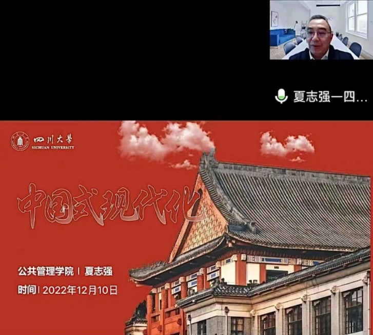 在第一单元中,夏志强院长就“中国式现代化”这一主题进行授课。夏院长从党的二十大报告出发,对中国式现代化的具体内涵和本质要求进行了解读,阐释其命题背景;接着,围绕各国现代化的共性分析了西方现代化对中国的启示及其存在的局限,提出中国式现代化区别于西方化现代化之处;最后,夏院长又从高质量发展是现代化的必由之路,教育和人才是现代化的关键环节,科技创新、科技驱动要重点突破,共同富裕必不可少,人与自然和谐共生,文化自信六个方面提出中国式现代化的实现路径,深化了同学们对中国式现代化道路的理解与认识。在随后的问答互动环节中,夏院长鼓励同学们担当青年使命,在实现中国式现代化赛道上奋勇争先。