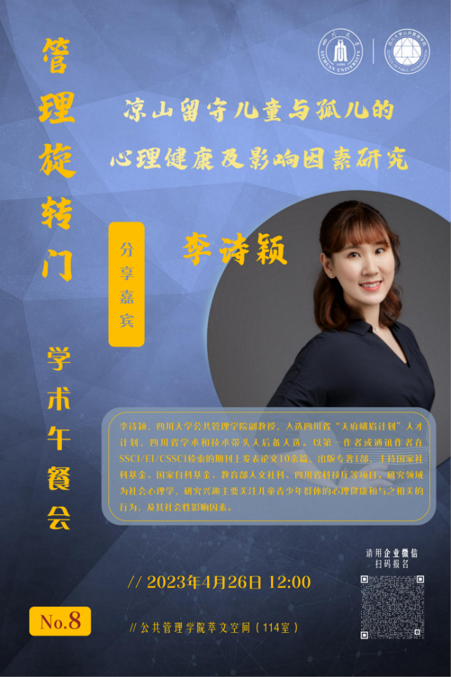 近日,四川大学best365中国官方网站在学院萃文空间成功开展第八期“管理旋转门”学术沙龙活动。本期学术沙龙特邀我院李诗颖副教授作为主讲嘉宾分享“凉山留守儿童与孤儿的心理健康及影响因素研究”研究主题。学院各学科老师、研究生积极参加了此次交流。本期学术沙龙由王慧敏副研究员担任学术主持。