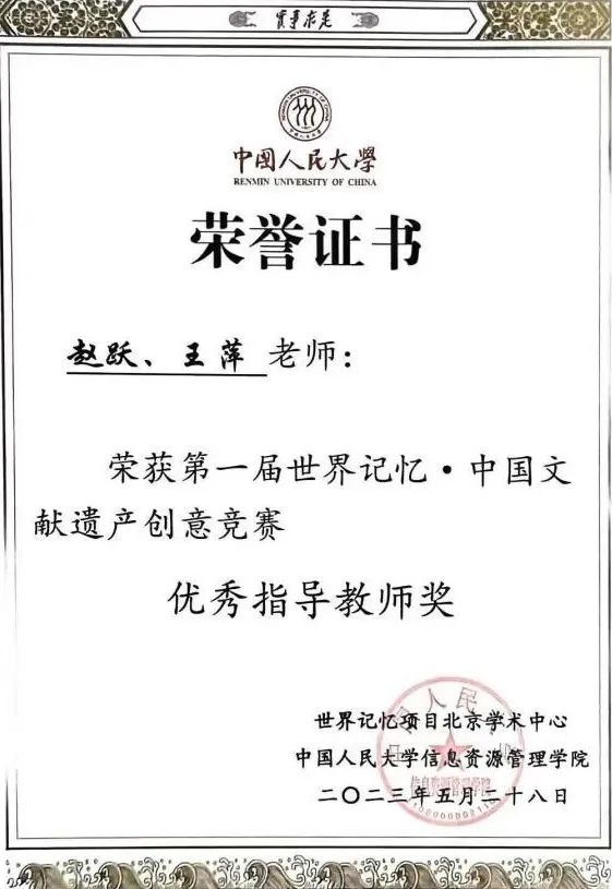 5月28日,“世界记忆•中国文献遗产创意竞赛”决赛于中国人民大学举行。此次比赛由世界记忆项目中国国家委员会、联合国教科文组织世界记忆项目学术中心工作组、教育部高等学校档案学专业教学指导委员会指导,世界记忆项目北京学术中心与中国人民大学信息资源管理学院联合世界记忆项目澳门学术中心、苏州学术中心、福建学术中心,以及中国第一历史档案馆、苏州市工商档案管理中心、孔子博物馆等多家机构共同推出。大赛发布后,全国各地高校热烈响应,比赛共吸引来自29个省(自治区/直辖市)、112所高校的档案学、图书情报、艺术设计、历史学等专业155支团队,共631位大学生报名。