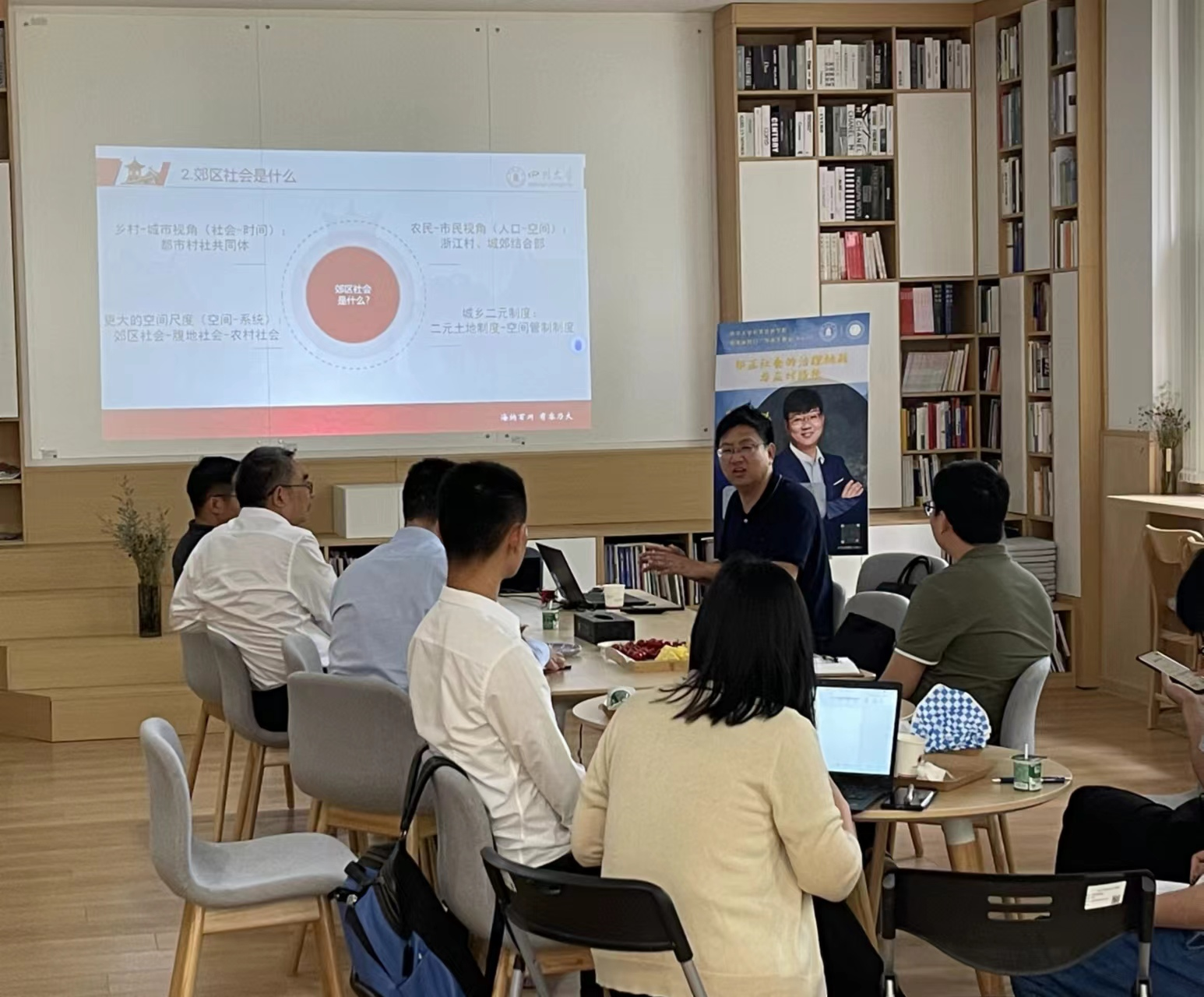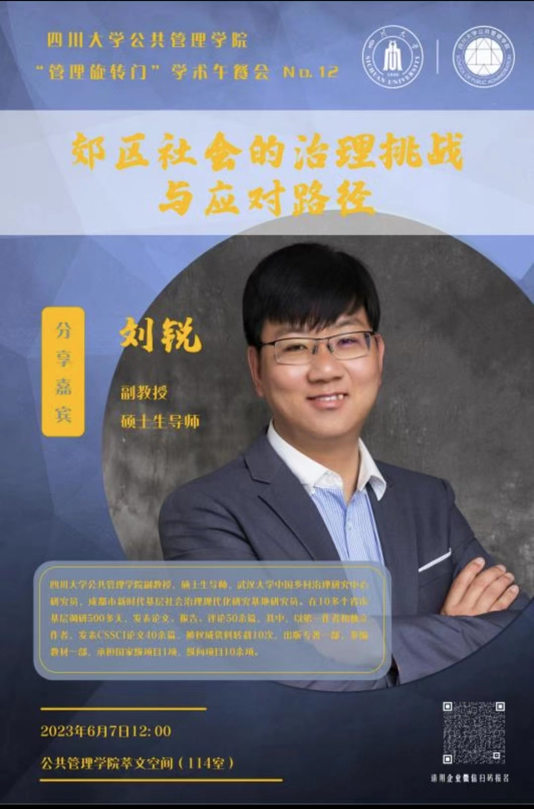 6月7日,四川大学best365中国官方网站在学院萃文空间成功开展第12期“管理旋转门”学术沙龙活动。本期学术沙龙特邀我院副教授刘锐老师作为主讲嘉宾分享“郊区社会的治理挑战与应对路径”主题。学院领导班子成员、各学科老师、研究生积极参加了此次交流。