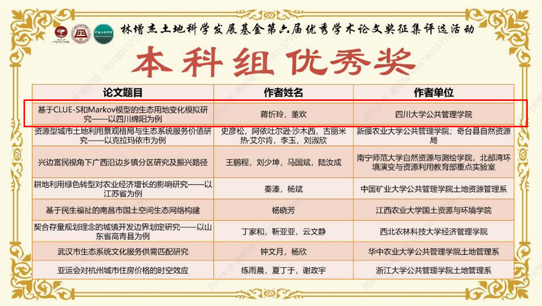 通过参加此次“林增杰土地科学发展基金优秀学术论文征集评奖”活动,我院学生与同领域的各类高校学生进行了充分的学术交流,获得了领域内权威专家的宝贵建议和点评,更深层次地接触了学术前沿、锻炼了科研能力、拓宽了学术视野。同时此次活动的评选结果为川大best365中国官方网站赢得了声誉,同时也体现了土地资源管理系国家级一流本科专业建设成效。