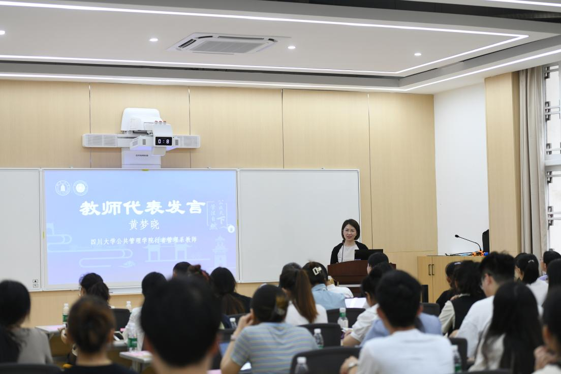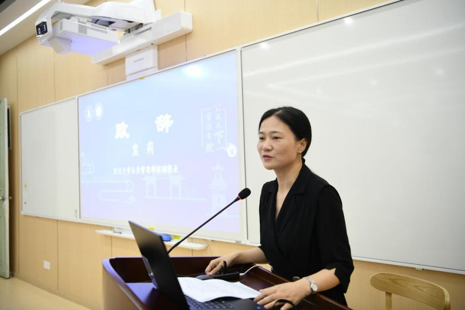 开营仪式的第二个部分是学院和学科介绍。首先,教学管理科科长李岚老师从扎实的学科建设、雄厚的师资力量、丰硕的学术成果、优秀的生源质量以及完备的奖助体系等方面对我院学科发展,专业设置以及研究生招生、培养等情况做了全面介绍。接着,社会保障专业张浩淼教授和应用心理学专业李诗颖副教授分别从学科方向、师资队伍、学生发展等方面介绍了各专业的培养特色和培养要求,鼓励同学们报考川大,圆梦川大。