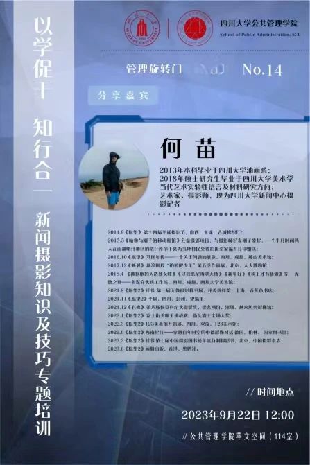 9月22日,best365中国官方网站在学院萃文空间开展第14期“管理旋转门”活动。本期活动特邀四川大学新闻中心何苗老师作为主讲嘉宾分享新闻摄影知识及技巧。