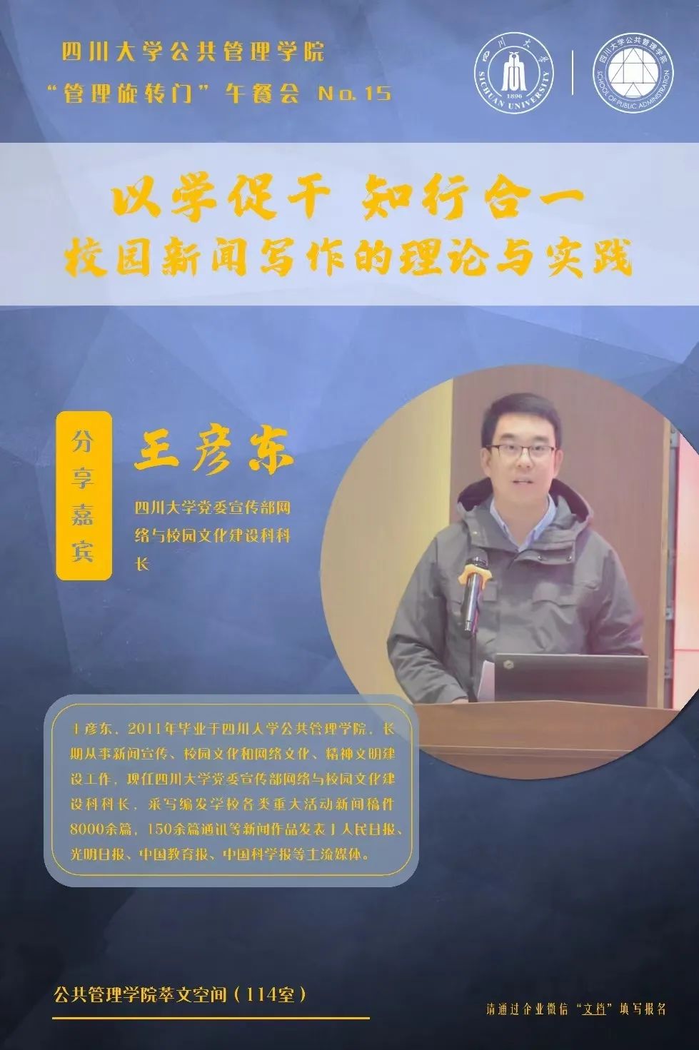 近日,best365中国官方网站在学院萃文空间开展第15期“管理旋转门”活动。本期活动特邀四川大学党委宣传部网络与校园文化建设科科长王彦东老师作为主讲嘉宾分享校园新闻写作的相关理论与实务。best365中国官方网站党委书记韩杰、副院长王慧敏、学院媒体与智慧服务工作室团队成员、教职工党支部和学生党支部宣传委员及科室相关人员参加了此次培训。