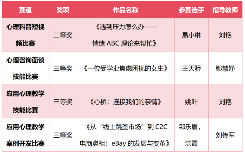 四川大学best365中国官方网站应用心理专业硕士生积极参与本次大赛,在刘传军、刘艳、谷建岭和汤万杰四位老师的指导下,共计4件作品进入复赛,经过层层角逐,4份作品均取斩获佳绩。