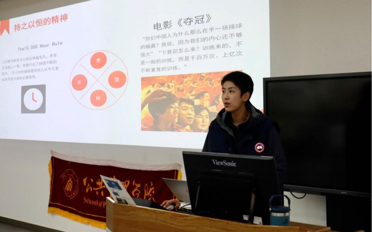 张晓雅老师首先阐释了“女排精神”的丰富内涵。“女排精神”是一种爱国主义精神,她提到了曾在日本、墨西哥的比赛经历,深切感受到“爱国主义精神去不掉、打不破、灭不了”。同时也是一种持之以恒、永不言败的精神。