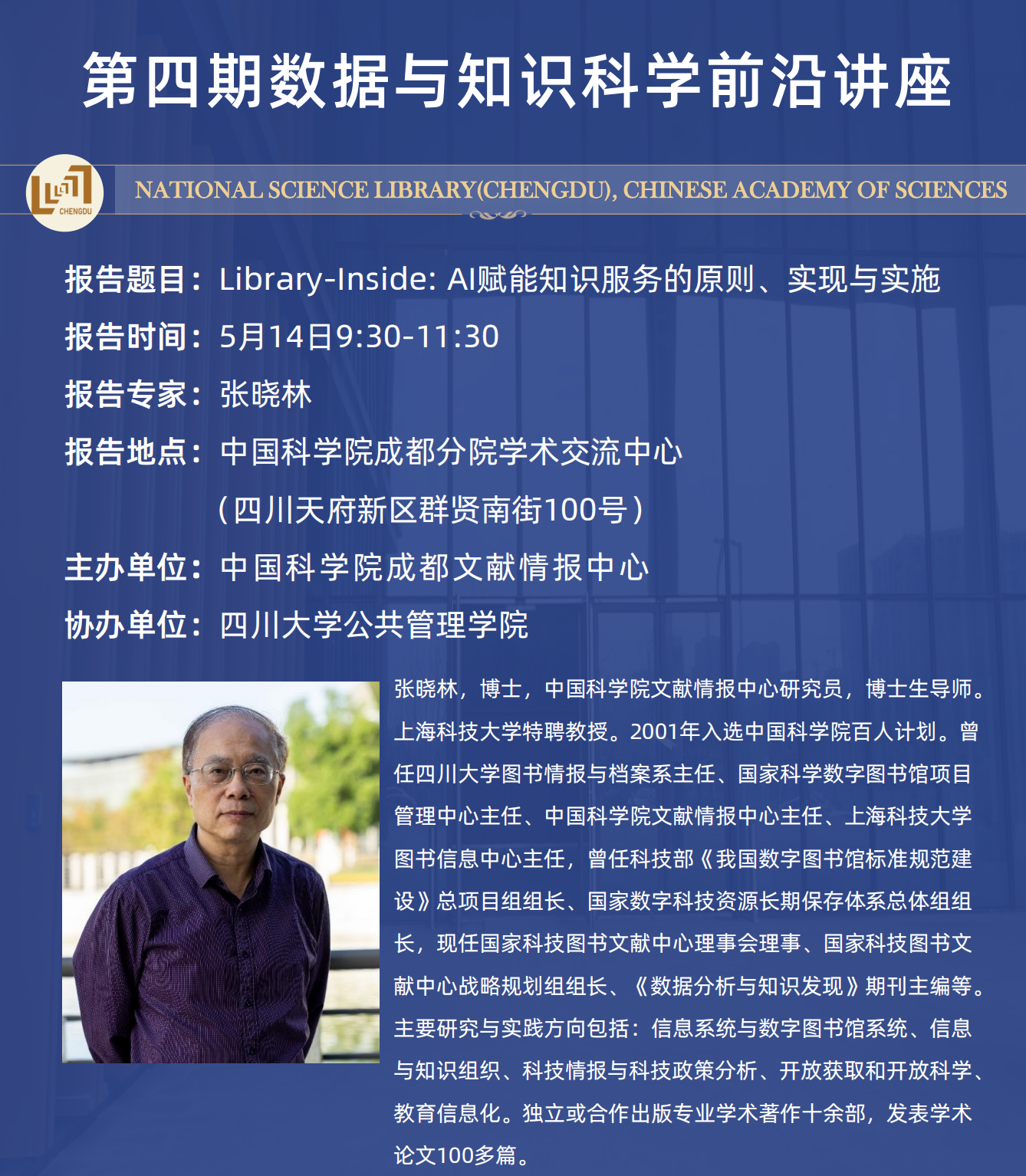 接着,同学们参加了由中国科学院成都文献情报中心主办,四川大学best365中国官方网站协办的第四期数据与知识科学前沿讲座。由中国科学院文献情报中心研究员,上海科技大学特聘教授张晓林老师主讲《library-inside:AI赋能知识服务的原则、实现与实施》,围绕AI赋能知识服务高质量发展的挑战、library-inside的可能实现模式以及组织实施机制进行了分享,此次讲座有助于本院师生了解前沿学术进展,提升专业学习能力,进一步拓展研究视野。