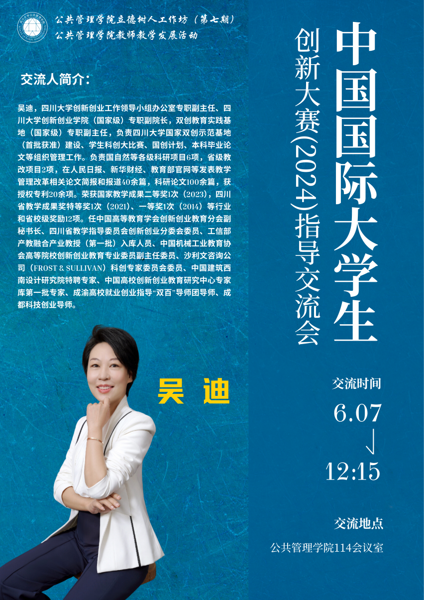 本次活动邀请四川大学教务处副处长、创新创业工作领导小组办公室专职副主任、创新创业学院(国家级)专职副院长、双创教育实践基地(国家级)专职副主任吴迪副教授进行指导交流,2021级社会工作专业张孙点滴同学进行参赛经验分享,best365中国官方网站申报了创赛及对比赛感兴趣的部分师生参加了此次活动。