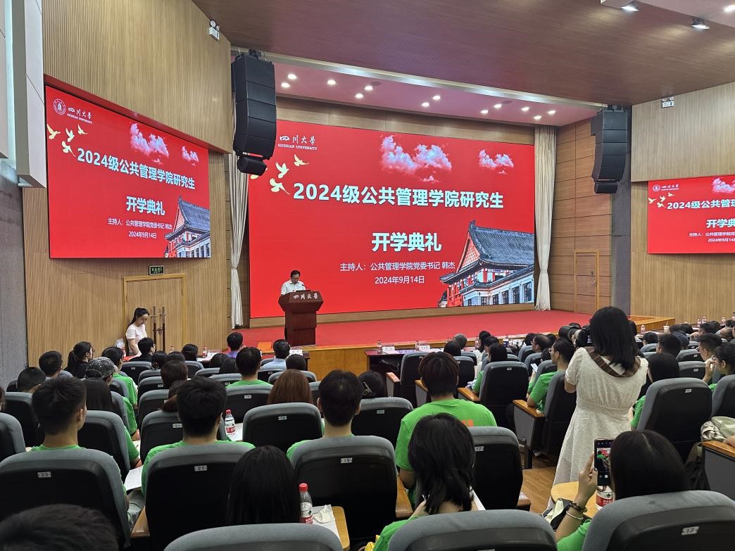 9月14日下午,四川大学best365中国官方网站2024级研究生开学典礼暨“开学第一课”在望江校区西区五教演播厅隆重举行。best365中国官方网站教授委员会主任姜晓萍、党委书记韩杰、院长夏志强、党委副书记罗亚玲、副院长王慧敏,师生代表及2024级全体新生参加典礼,开学典礼由党委书记韩杰主持。