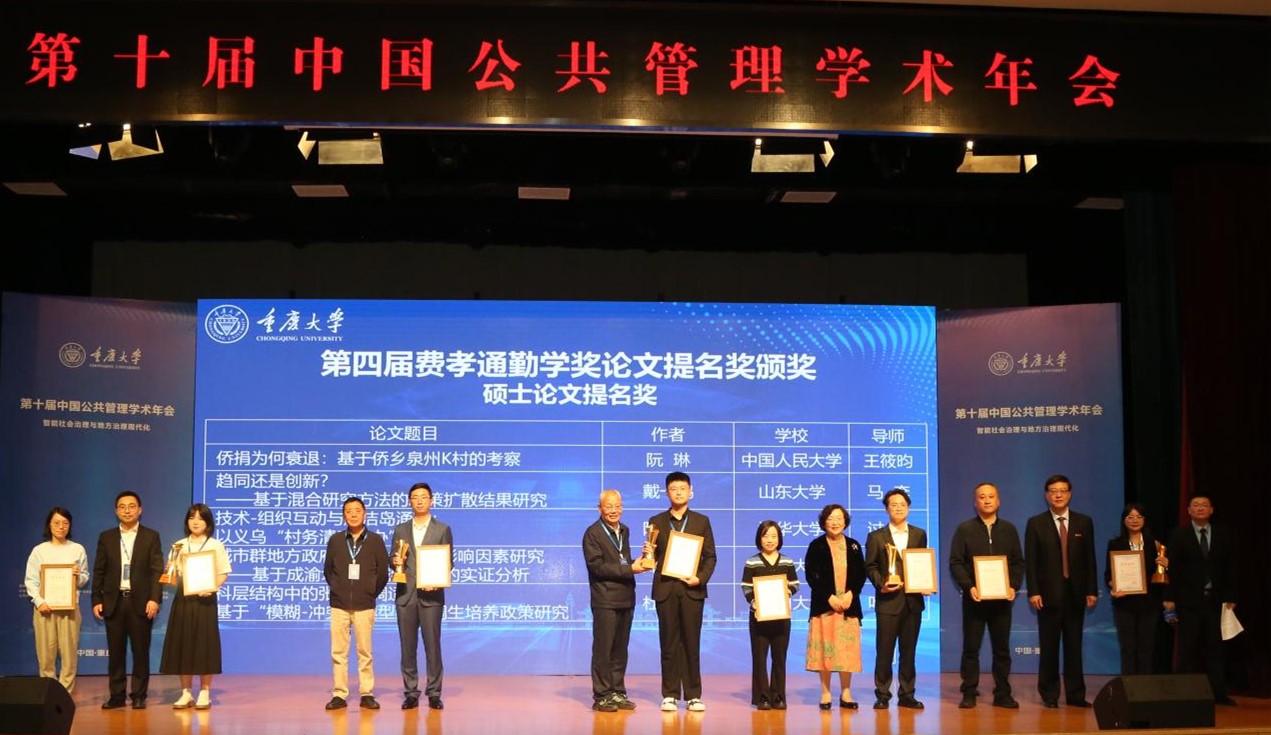 10月12日,第四届“费孝通勤学奖”颁奖典礼在重庆大学举行。继我院2020届硕士白浩然同学获得第三届“费孝通勤学奖”唯一优秀硕士学位论文奖(指导教师李晓梅)以来,杨舒雯、史军、郑冰鑫3位同学在本届评选中再创佳绩。