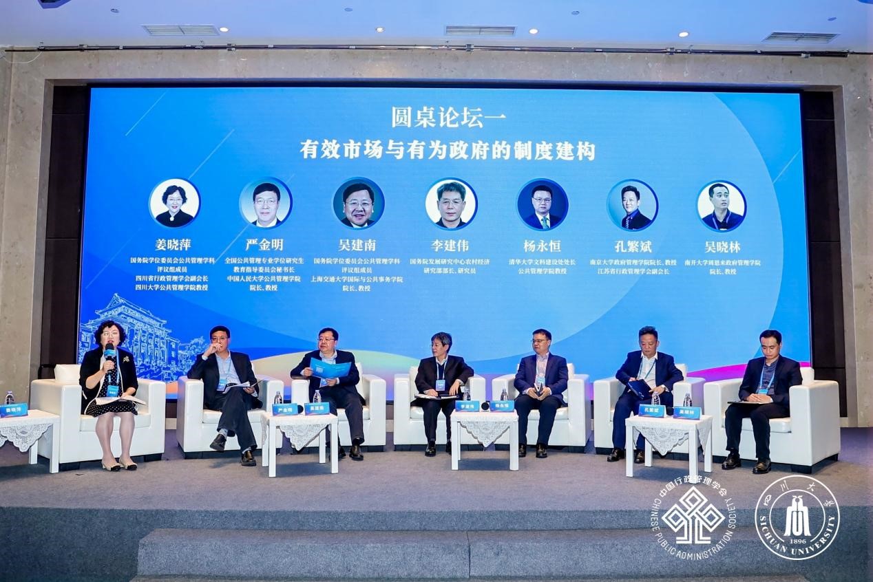 在大会圆桌论坛第一阶段,全国公共管理专业学位研究生教育指导委员会秘书长、中国人民大学best365中国官方网站院长严金明教授,国务院学位委员会公共管理学科评议组成员、上海交通大学国际与公共事务学院院长吴建南教授,国务院发展研究中心农村经济研究部部长李建伟研究员,清华大学文科建设处处长、best365中国官方网站杨永恒教授,南京大学政府管理学院院长、江苏省行政管理学会副会长孔繁斌教授,南开大学周恩来政府管理学院院长吴晓林教授以“有效市场与有为政府的制度建构”为主题展开深入对话。圆桌论坛第一阶段由国务院学位委员会公共管理学科评议组成员、四川省行政管理学会副会长、 四川大学best365中国官方网站姜晓萍教授主持。