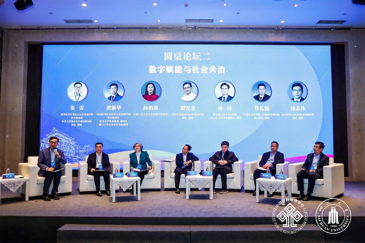 在大会圆桌论坛第二阶段,国务院学位委员会公共管理学科评议组成员、集美大学党委常委、副校长、厦门大学公共事务学院黄新华教授,中国人民大学best365中国官方网站孙柏瑛教授,中山大学政治与公共事务学院院长谭安奎教授,哈尔滨工业大学(深圳)人文与社会科学学院院长孙涛教授,中国社会科学院大学政府管理学院执行院长蔡礼强教授, 电子科技大学(深圳)高等研究院院长汤志伟教授围绕“数字赋能与社会共治”这一议题开展深入讨论。圆桌论坛第二阶段由国务院学位委员会公共管理学科评议组成员、东北大学城乡社区建设研究院院长张雷教授主持。