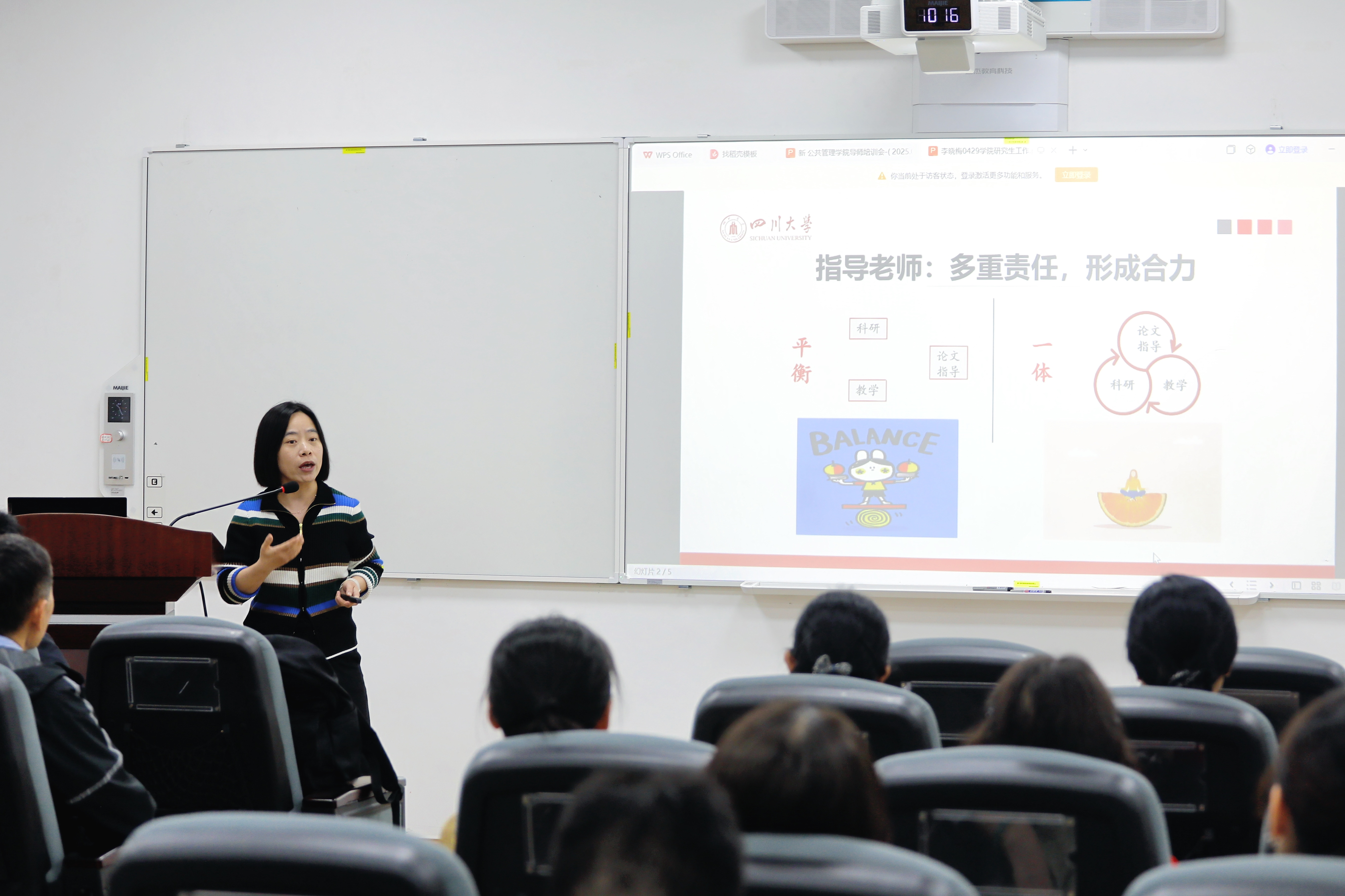 本次培训还邀请了2位优秀硕士生导师分享经验。其中,行政管理系李晓梅副研究员结合自身经历,分享了她制定的《研究生论文指导计划表》。她强调导师在平衡科研、教学的同时,要将研究生论文指导细化到每个学期,鼓励学生积极行动,在每个阶段提前完成任务。信息资源管理硕士点负责人王萍教授从优秀论文的标准、论文指导的核心理念及选题、写作、质量把关三个关键环节分享了论文指导经验。她指出,论文选题应尊重学生科研兴趣与前期基础,导师可根据研究进展和遇到的问题,帮助学生动态调整目标和计划,做好质量把关。