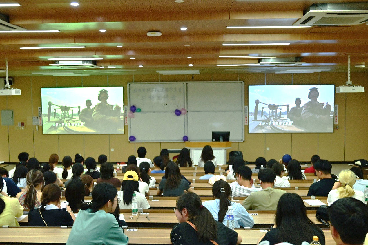 在江安校区综合楼,学院200余名本科生集体观看纪念中国人民抗日战争暨世界反法西斯战争胜利80周年阅兵视频。随着阅兵分列式展开,徒步方队迈着“踢腿生风、落地砸坑”的整齐步伐驶过镜头,装备方队中兼具威慑力与科技感的大国重器依次亮相,空中梯队以精准队形掠过天际——每一个场景都让同学们屏息凝视,现场不时爆发热烈掌声。