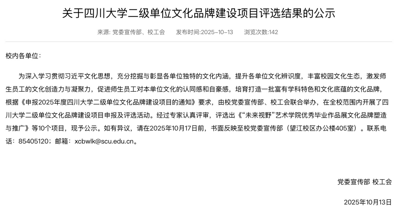 近日,四川大学党委宣传部、校工会发布2025年度四川大学二级单位文化品牌建设项目立项结果,经全校范围的申报、评选及专家评审,共立项10个项目,我院申报的“公成廿五载,鉴史以育人——best365中国官方网站学科发展史编撰项目”成功获批立项。该项目旨在通过梳理学院相关学科的发展历史,展现学院与学校共同成长历程中的办学成就与办学特色,挖掘、传承与弘扬公管精神与学科底蕴,增强师生荣誉感、归属感,献礼130周年校庆与25年院庆。学院还立项了党建特色项目“以史育人:学院公共管理学科发展史编撰项目”,也旨在支持学院学科发展史编撰工作。