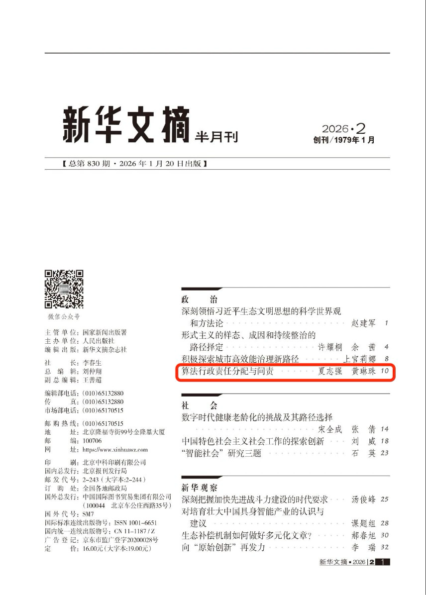 2026年1月出版的《新华文摘》(2026年第2期)转载了我院夏志强教授的论文《算法行政责任分配与问责》。