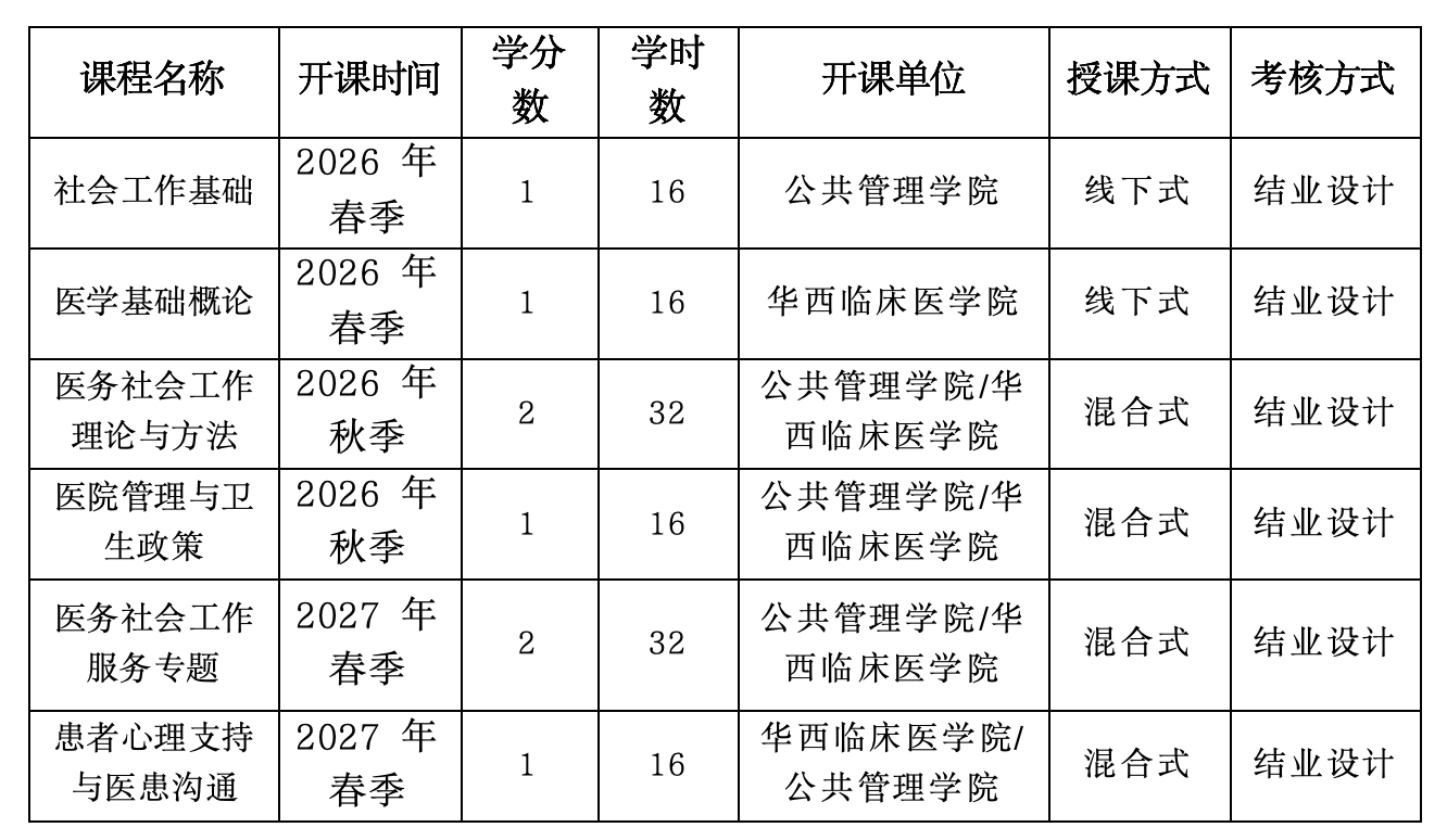采用“课程学习+定向实训”培养模式,依托best365中国官方网站社会工作专业与华西医院多部门(科室)师资,提供6门“线上+线下”课程,计8个学分,涵盖社会工作基础、医学基础、医务社工专题三个板块内容。