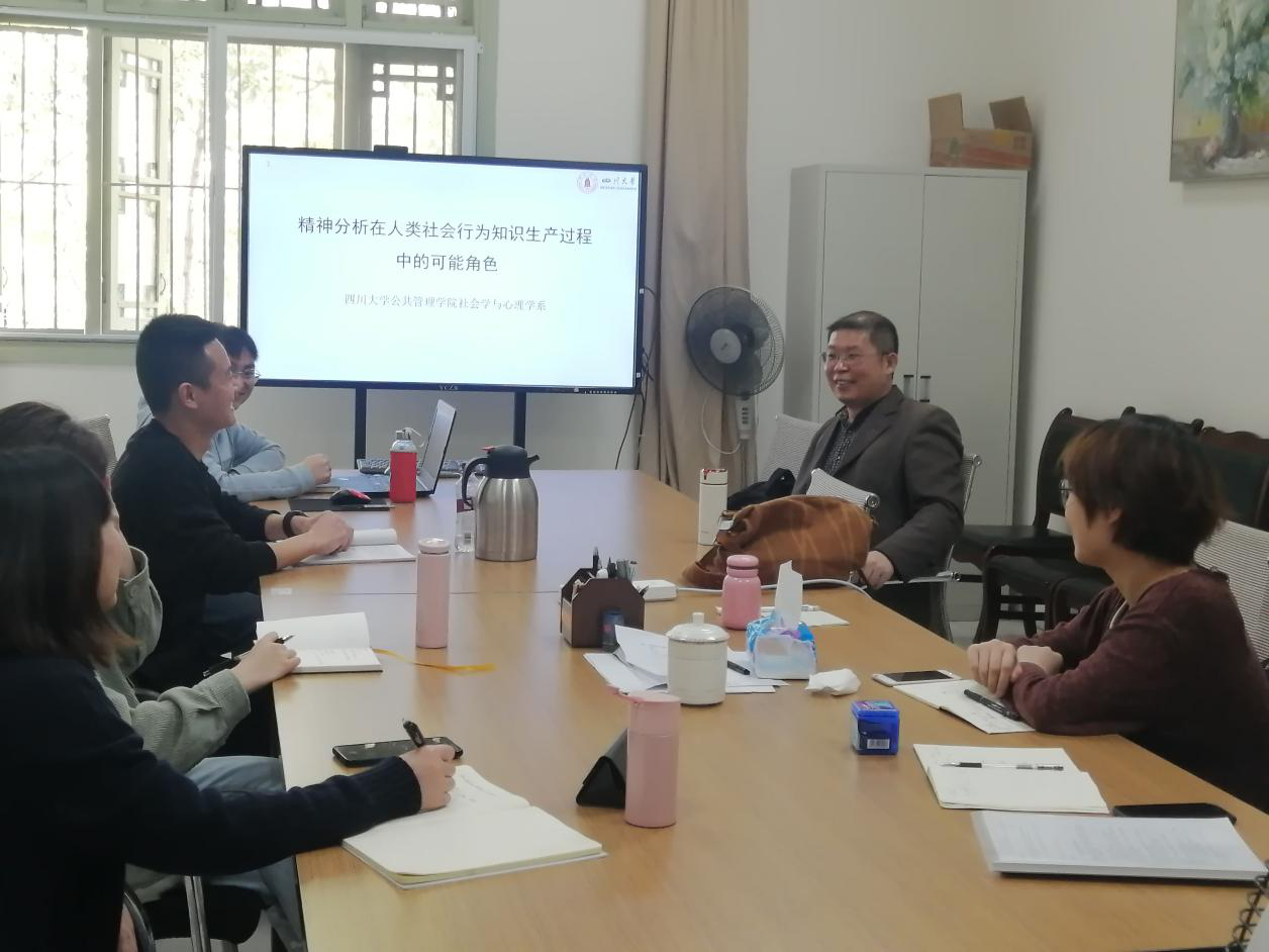 3月29日,社会学与心理学系举办了“精神分析与社会心理学研究的交叉融合”研讨会。本次研讨会由社会学与心理学系谷建岭、徐文健、刘传军三位老师联合组织,其他与会者主要包括四川大学社会学与心理学系精神分析方向的在读研究生。