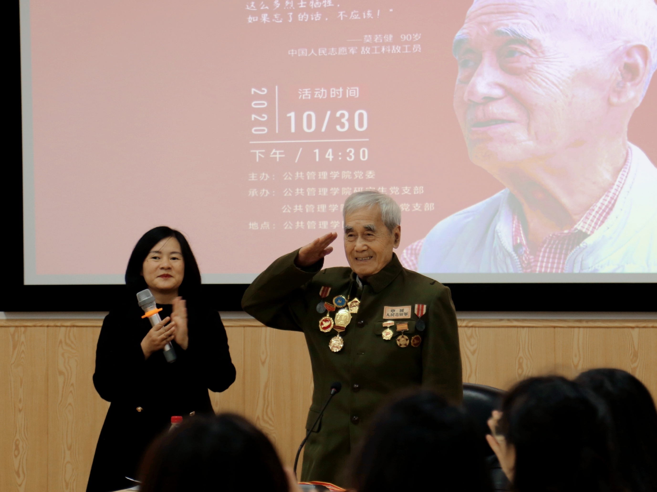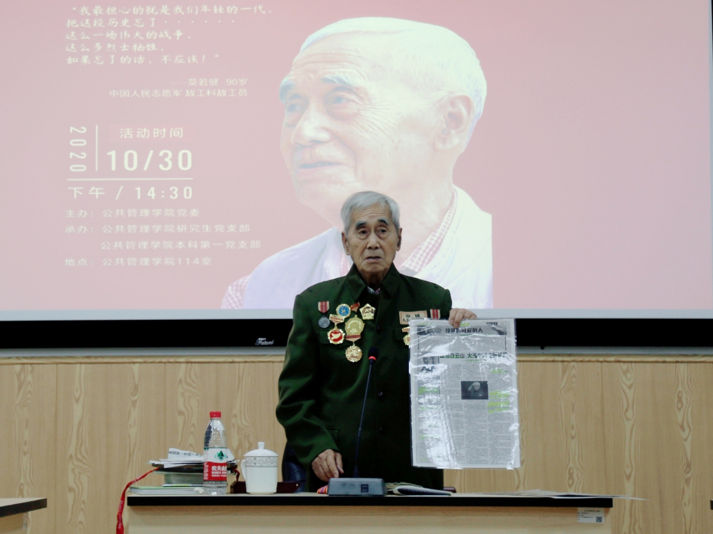 2020年10月30日下午2:30,best365中国官方网站“我的战争岁月——抗美援朝老兵莫若健故事分享会”主题党日活动在萃文楼114室成功举办,活动由best365中国官方网站副院长罗亚玲主持,学院专职组织员、2019级研究生第四党支部书记廖海燕,2020级研究生辅导员、本科第一党支部书记陈萱源和部分学生党员参加了此次活动。
