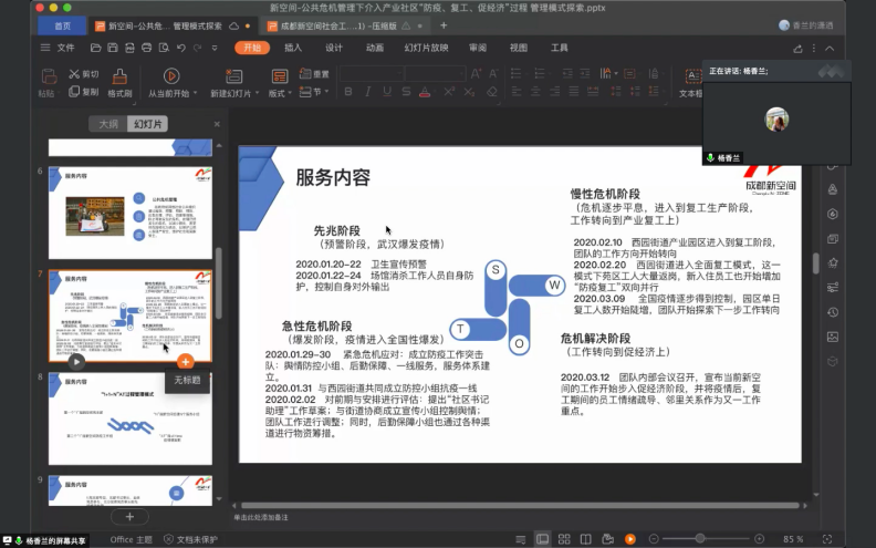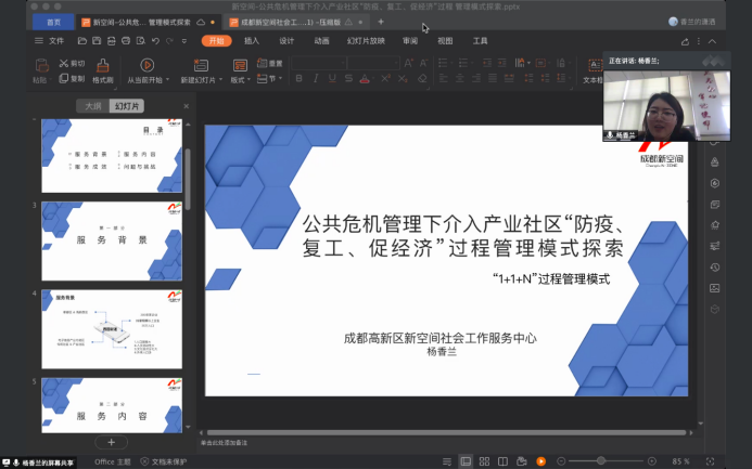 杨女士首先介绍了成都高新区新空间社会工作服务中心在疫情期间的实务工作,重点从服务内容、过程、成效、问题与挑战四个方面全面呈现了社会工作在公共危机管理下介入产业社区“防疫、复工、促经济”过程中的积极作用和功能。同学们深刻感受到,新空间作为成都市优秀一线社工机构的代表,其在抗疫防疫期间的工作是创新性的,体现了社会工作在面临公共卫生突发事件等新情况时必须不断探索公共服务管理新模式,以适应社会服务新的需求。