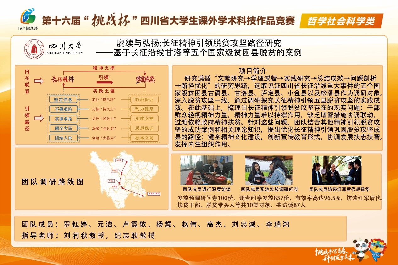 在本次调研与备赛的过程中,同学们深刻地领会了长征精神与脱贫攻坚精神一脉相承的红色底色,指导教师和参赛学生以川大人的强烈社会担当和不懈努力展现了我校及院系的科研创新实力和爱国情怀。