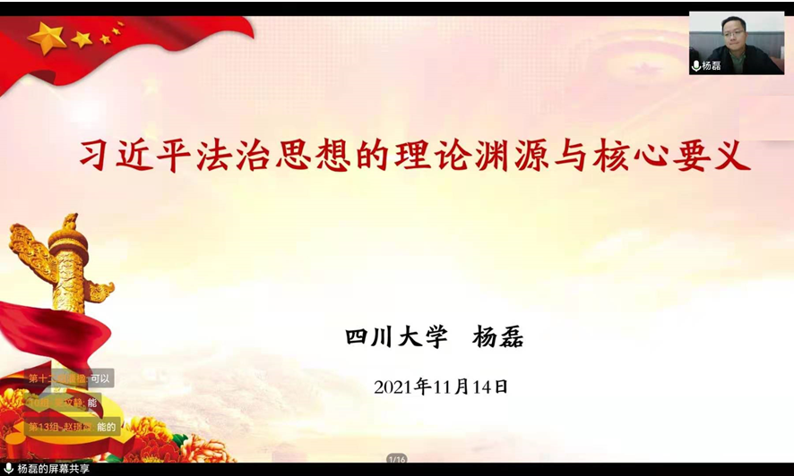11月14日下午13:30,我院党委副书记杨磊老师带来了本次提升班的最后一堂讲座“习近平法治思想的理论渊源与核心要义”,讲座由苟欢老师主持。