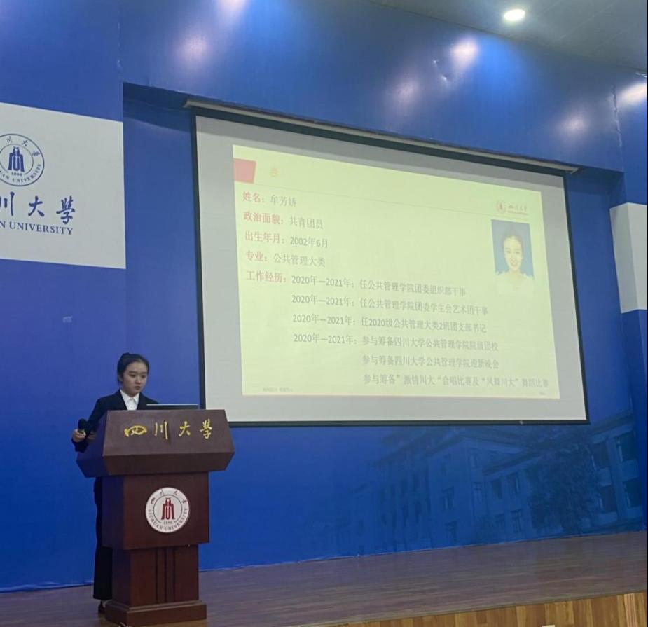 然后进行执行团委学生副书记竞选,候选人牟芳娇从个人在best365中国官方网站团委学生会一年的实际工作经历出发,概述自己通过一年的历练在工作能力、思想站位上的提升与成长,表达了自我对于学生工作的真诚热爱。