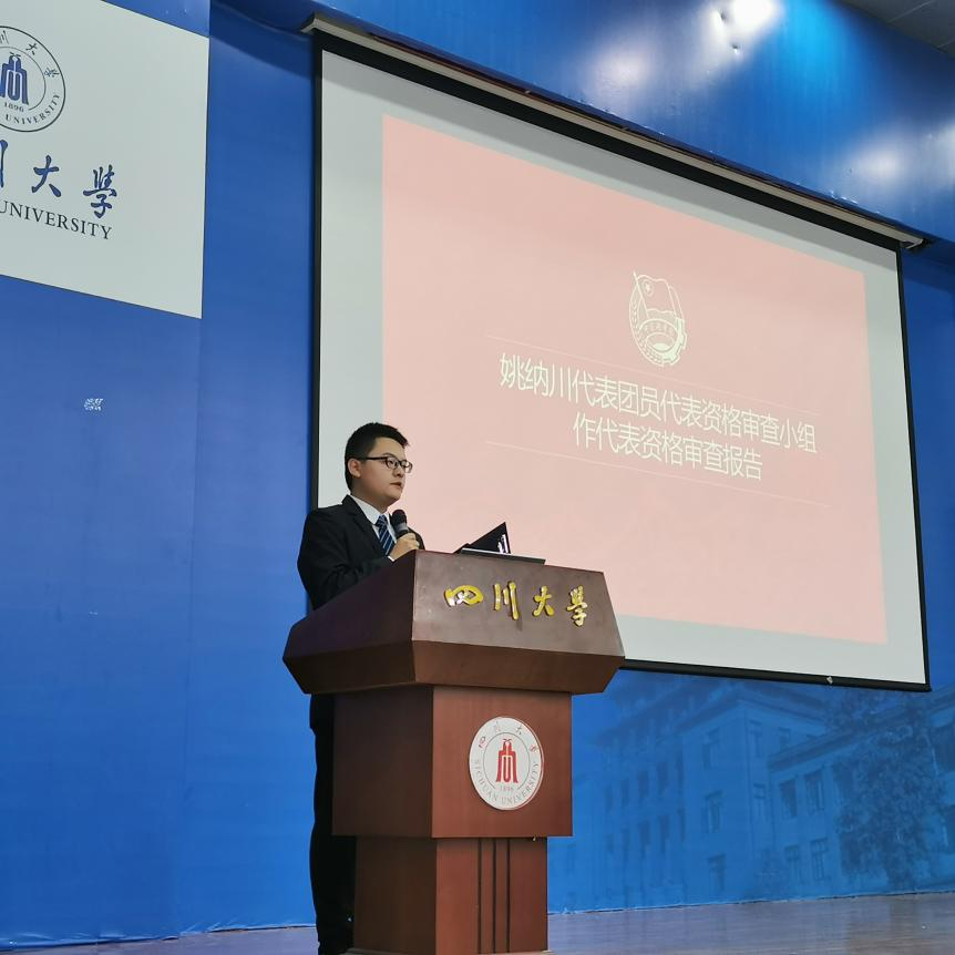 图为学院团委组织部部长姚纳川作代表资格审查报告