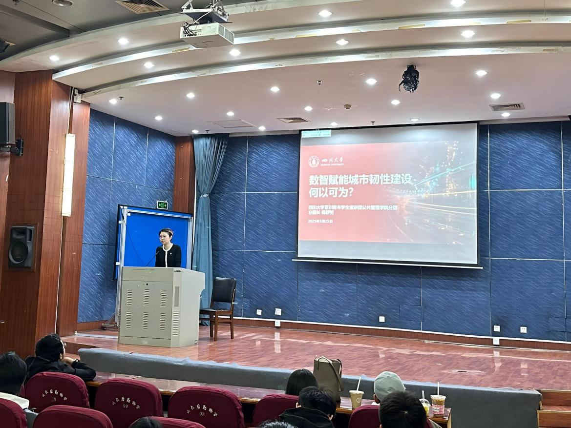 为深入学习贯彻党的二十届三中全会和全国“两会”精神,助力本科生学风建设,2025年3月25日,四川大学百川青年学生宣讲团best365中国官方网站分团在江安校区二基楼B座报告厅举办“数智赋能城市韧性建设何以可为”主题宣讲活动。活动立足新时代城市治理需求,紧扣二十届三中全会“深化城市安全韧性提升行动”战略部署,通过系统解读“城市智慧高效治理新体系”的实践路径,为2024级本科生搭建理论学习与实践认知的贯通平台。宣讲由分团指导教师陈萱源主持,宣讲团团长杨舒雯担任主讲。